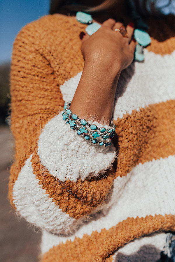 You will be an "endless style inspiration" when you wear this statement bracelet set featuring three bands with inset turquoise faux stones!