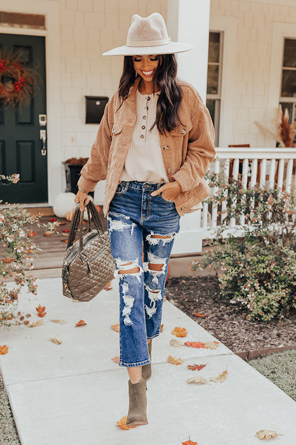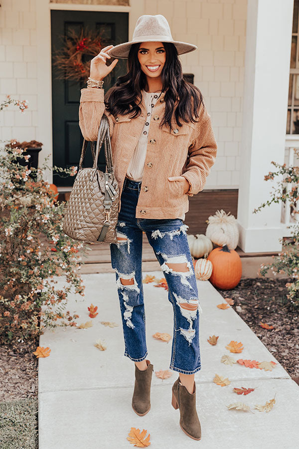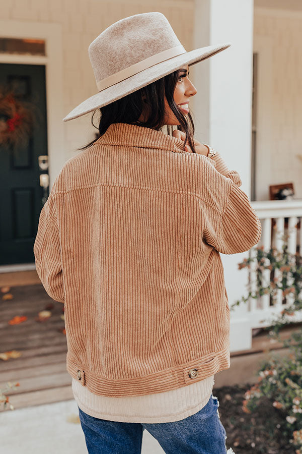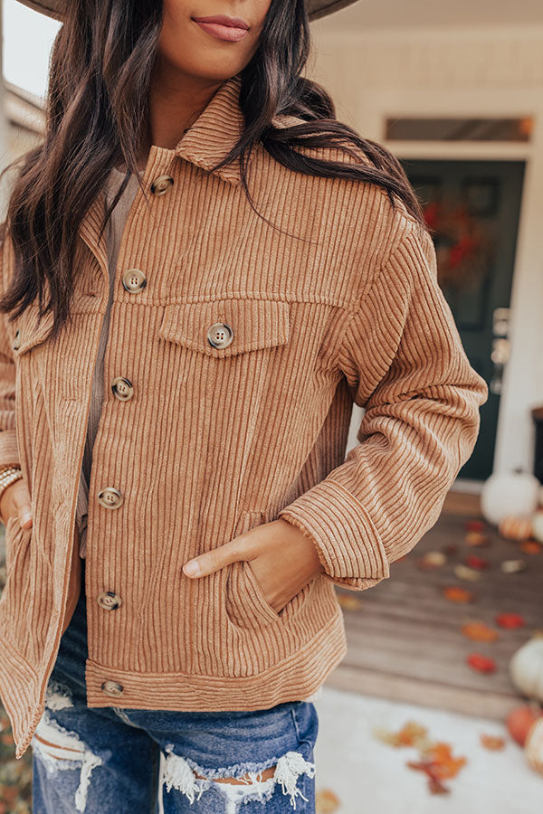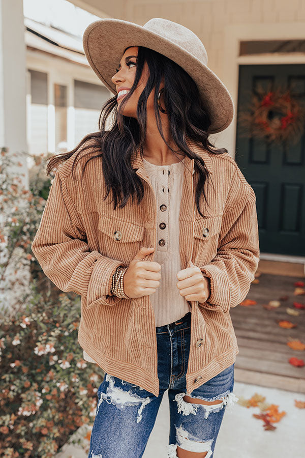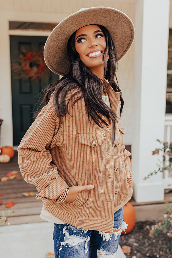 Comfortably layer up with our stylish khaki colored "English Countryside" jacket featuring lightweight corduroy material, long loose sleeves with button cuffs that can be rolled, a tortoiseshell button down front with a collared neckline, accent side and chest pockets with flap closures, and a flattering silhouette that ends in a straight hemline! Measurements