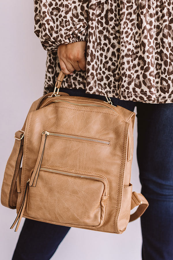 There is no better travel companion to take on all your "epic adventures" than this khaki faux leather backpack adorned with a tote handle, adjustable shoulder straps, two side pouches, and a large zippered pocket with two smaller ones on the outside!