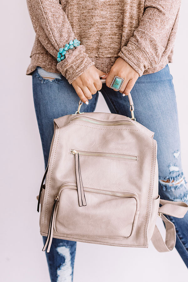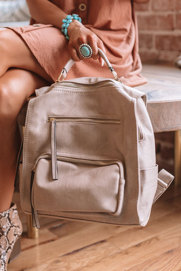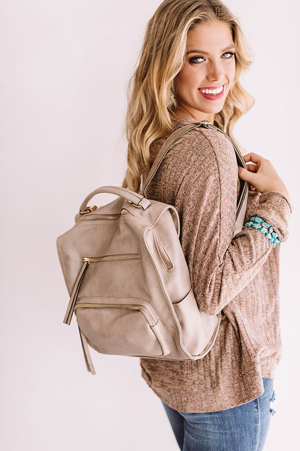 There is no better travel companion to take on all your "epic adventures" than this taupe faux leather backpack adorned with a tote handle, adjustable shoulder straps, two side pouches, and a large zippered pocket with two smaller ones on the outside!