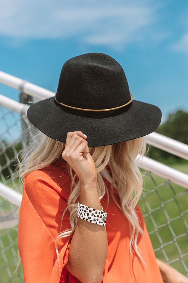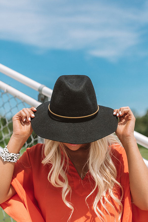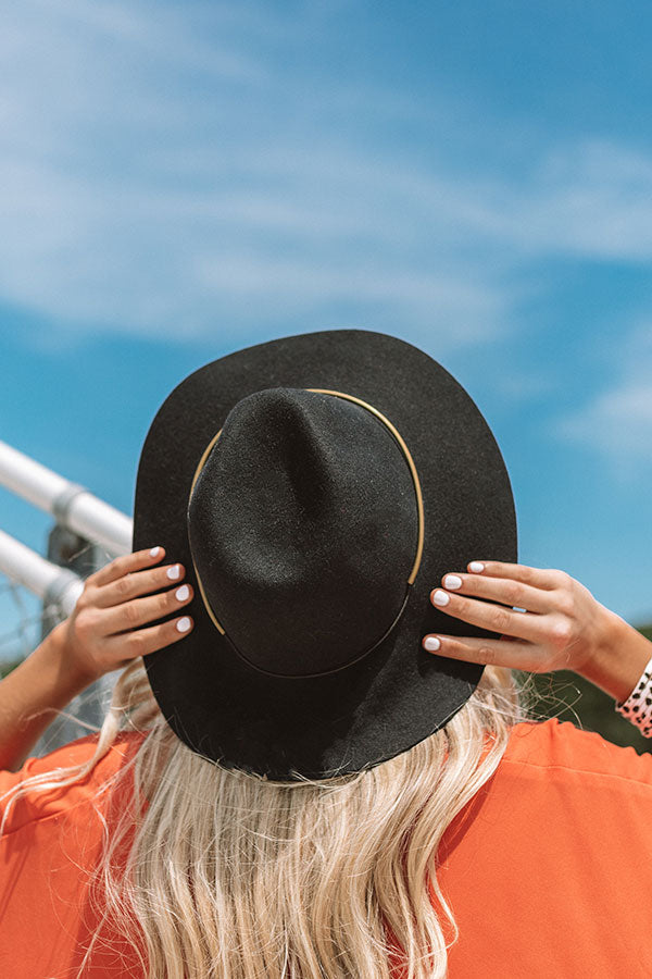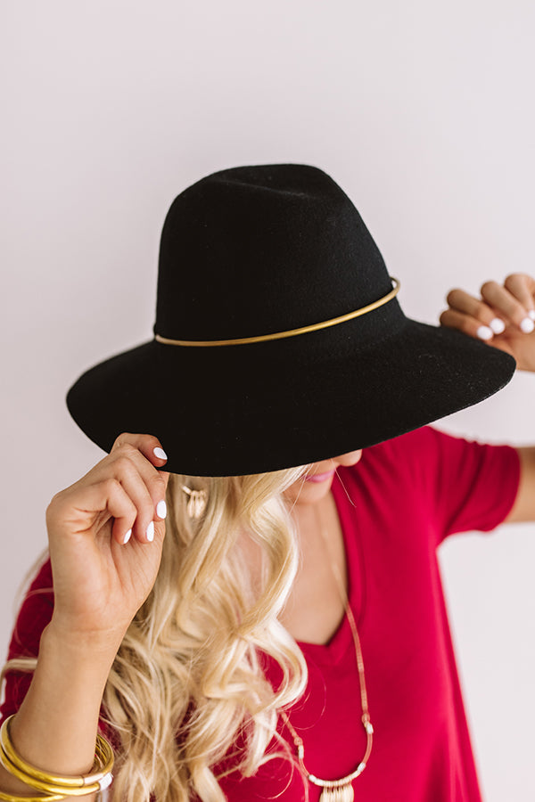 There is no better hat to wear on your "epic adventure" than this black hat with its felt fabric, wide brim, and gold accent!