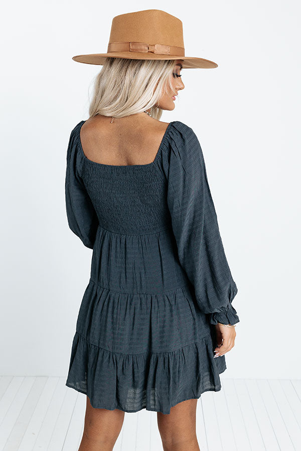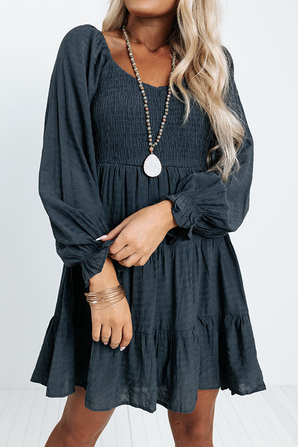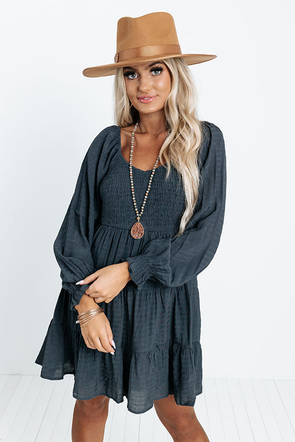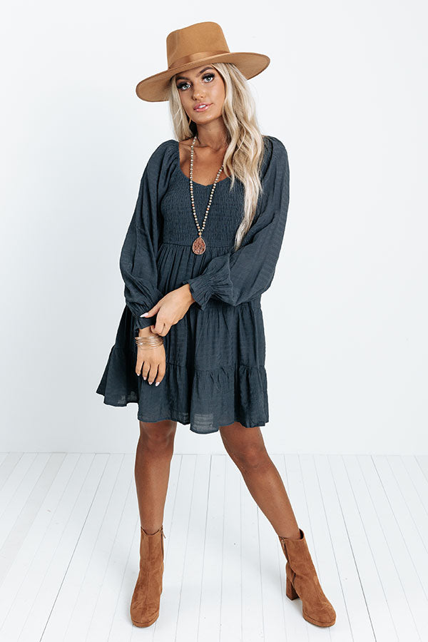 Dress to impress in our slate hued 'Epic Expectation Shift Dress' featuring lightweight flowy material with subtle texturing, a flattering form fitting smocked bodice with a scooped neckline, long bishop sleeves with fitted cuffs, and a relaxed tiered silhouette that falls into an uneven mid-thigh length hemline! Measurements