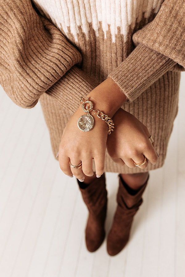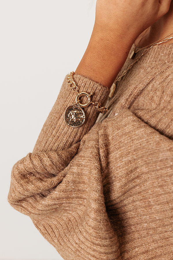 Don't hesitate to accessorize with our priceless 'Espresso In Italy' bracelet featuring a gold chain link with a toggle closure and coin charm accent!