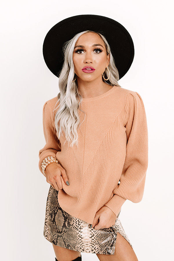 Welcome sweater weather in style with our darling tan 'European Holiday' top featuring soft lightweight and stretchy tight knit material with ribbed texturing, a high rounded neckline, long bubble sleeves with wide fitted cuffs, and a flattering silhouette that ends in a straight hemline.