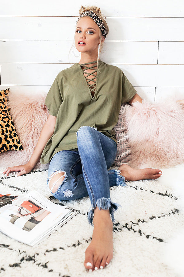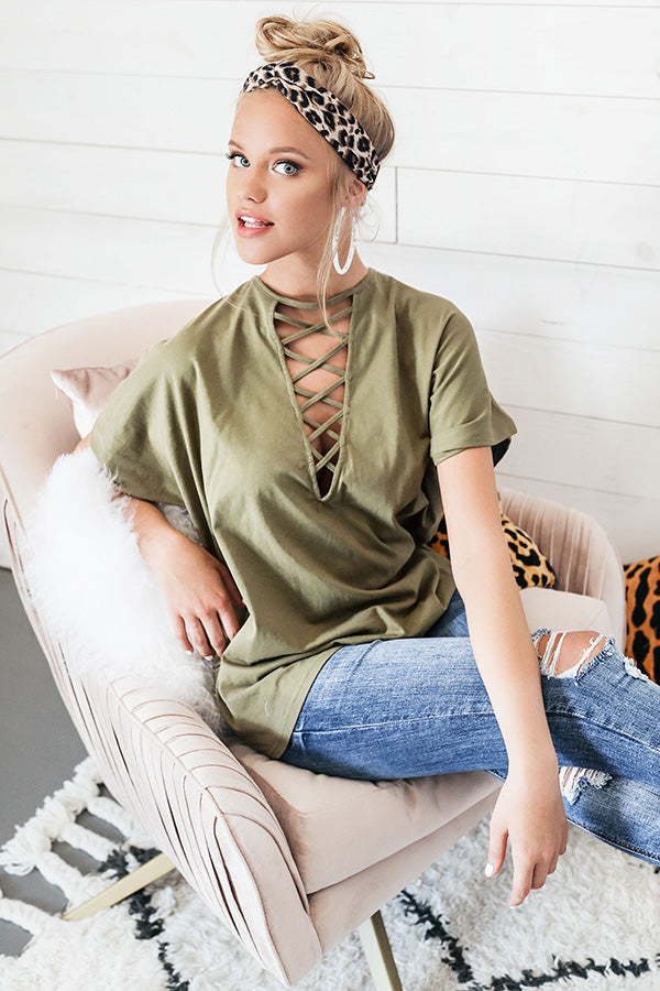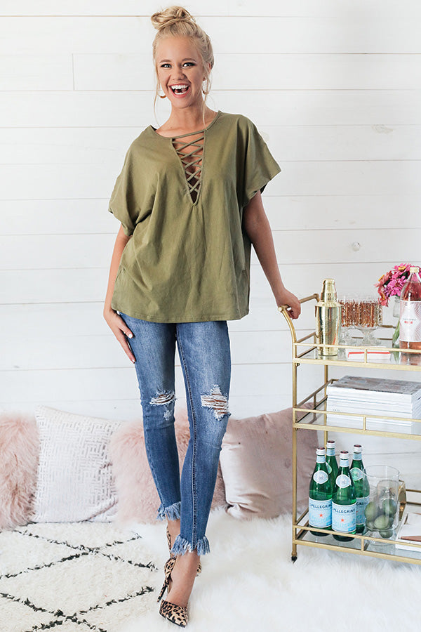 It's okay... I'm with the band! Get concert & coffee ready in minutes, with the "European Tour Shift Top" & your favorite distressed denim. This effortlessly edgy shift top has short sleeves, a relaxed cotton bodice & a criss-cross v-cut neckline that is fierce, flirty & ready to let the good times roll!