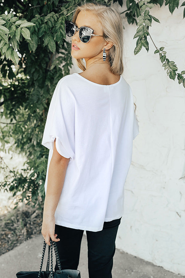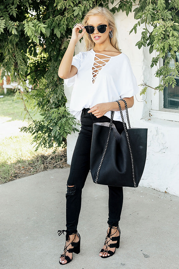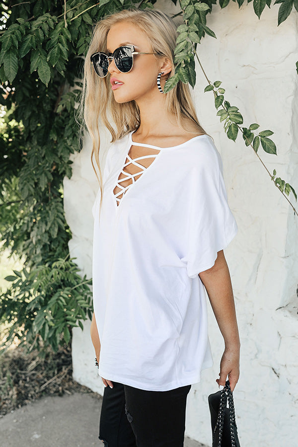 It's okay... I'm with the band! Get concert & coffee ready in minutes, with the "European Tour Shift Top" & your favorite distressed denim. This effortlessly edgy shift top has short sleeves, a relaxed cotton bodice & a criss-cross v-cut neckline that is fierce, flirty & ready to let the good times roll!
