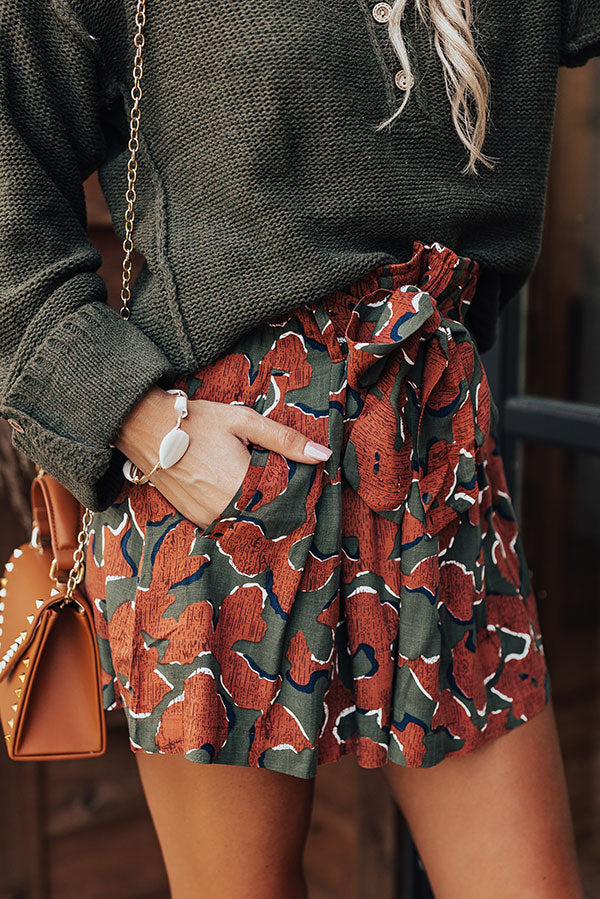 You will look ever so chic in these adorable rust colored shorts featuring lightweight shift material patterned with an olive hued abstract print, a high waistline with a tie belt, hidden side pockets, and a relaxed silhouette that falls into straight upper-thigh length hemlines! Measurements