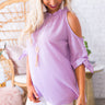 Give winter the cold-shoulder in this lovely lavender sweetie! This cold-shoulder cutie has a chic ruffled neckline, quarter-length sleeves that tie at the cuff & a relaxed shift bodice. Style with your favorite denim for your next girls night out!