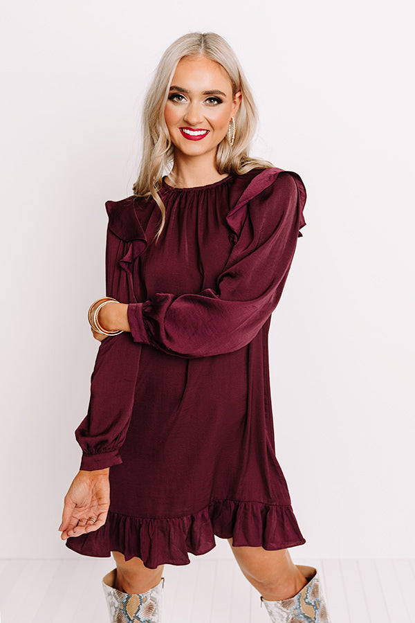 Dress to impress in our darling dark purple 'Everglow Shift Dress' featuring lightweight flowy material, a high rounded neckline, long loose sleeves with ruffled shoulder accents and fitted cuffs, a keyhole accented upper back with a button closure, and a relaxed silhouette that ends in a short peplum bottom with an uneven mid-thigh length hemline! Measurements