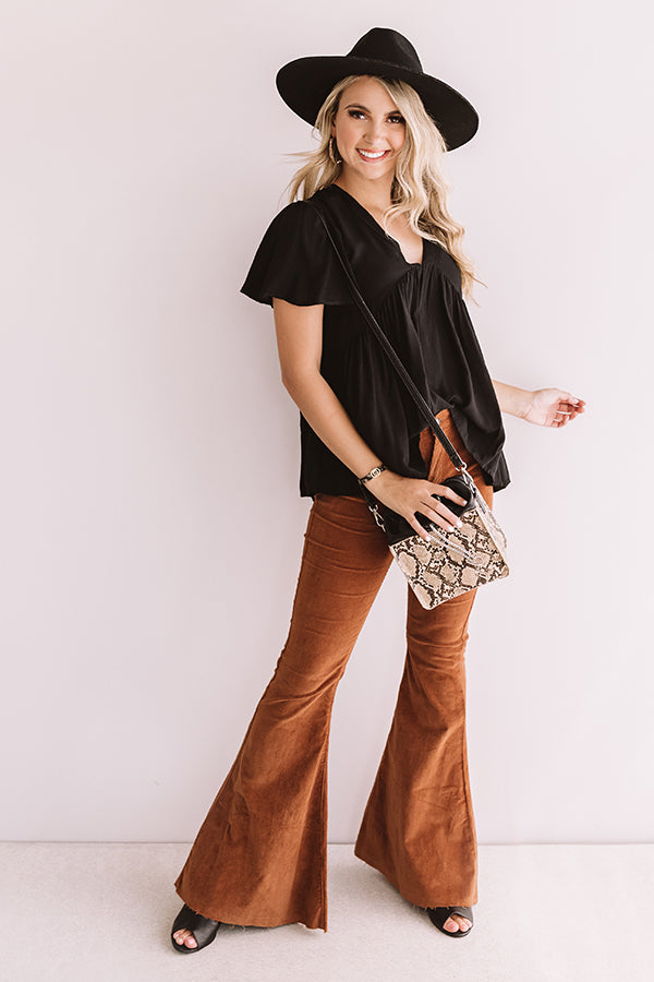 We guarantee this black top will bring you "everlasting joy" with its lightweight material, v-cut neckline, flounced short sleeves, and breezy babydoll silhouette that falls into an uneven hemline! This timeless piece can be styled with some oversized copper flares, a snake print crossbody, and a black peep toe bootie and faux suede hat, or you can layer it under "The Walker Distressed Denim Jacket" with some distressed white skinnies, "The Mia Faux Suede Lace Up Heel in Red," and our "Endless Celebration Earrings in Red" for a variety of fall looks that you will want to wear time and time again! Measurements