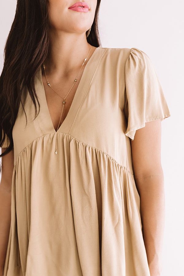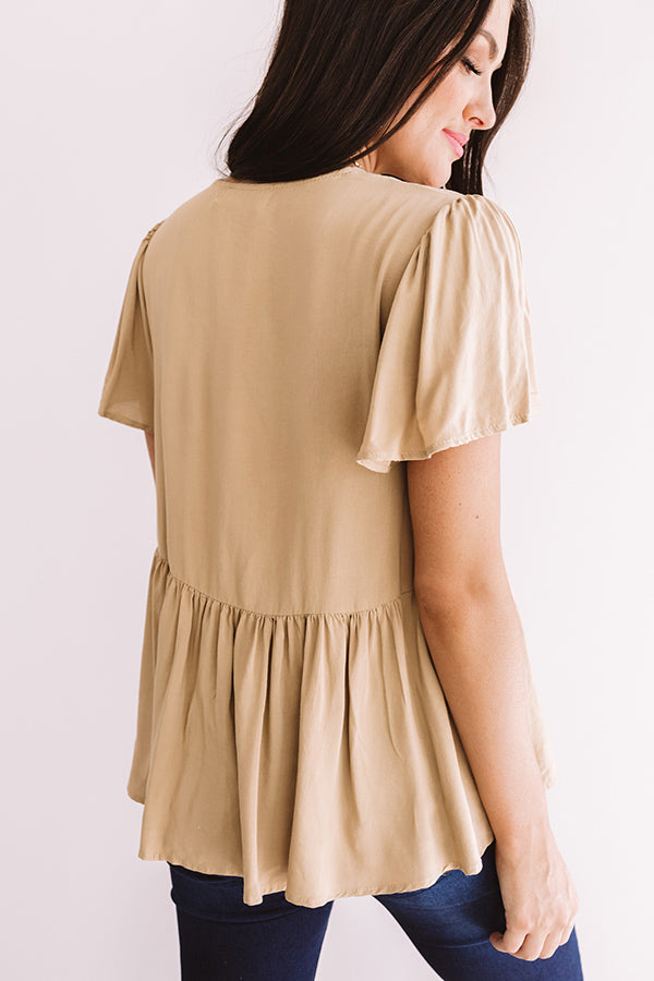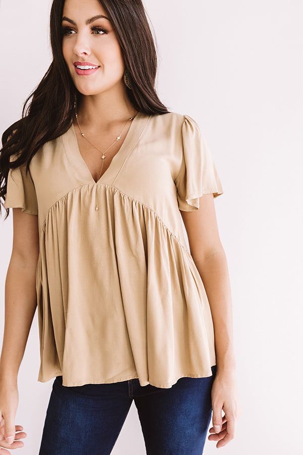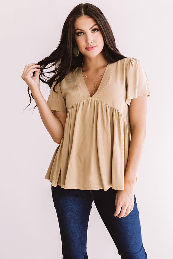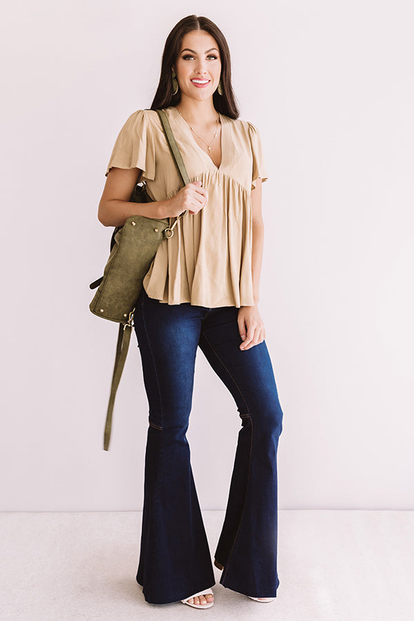 We guarantee this khaki top will bring you "everlasting joy" with its lightweight material, v-cut neckline, flounced short sleeves, and breezy babydoll silhouette that falls into an uneven hemline! This timeless piece can be styled with some dark denim flares, a white heel, simple jewelry, and an olive backpack, or you can layer it under "The Walker Distressed Denim Jacket" with some distressed black skinnies, "The Cassandra Snake Print Bootie," and our "All Caught Up Headband in Black" for a variety of fall looks that you will want to wear time and time again! Measurements