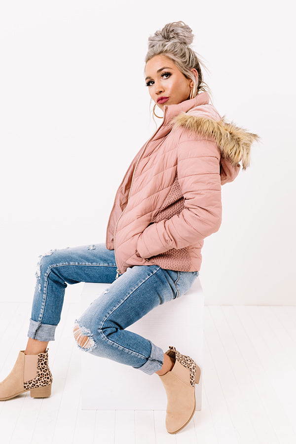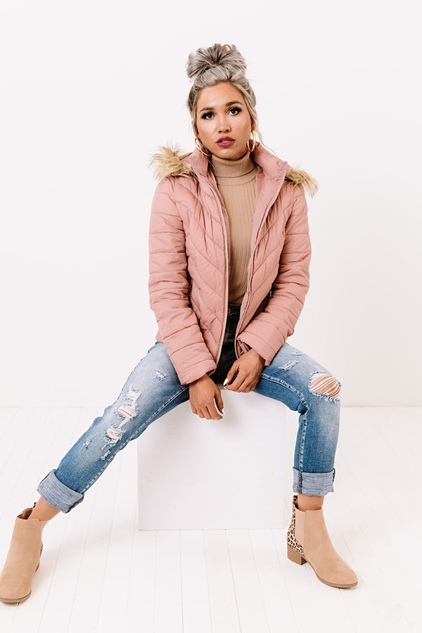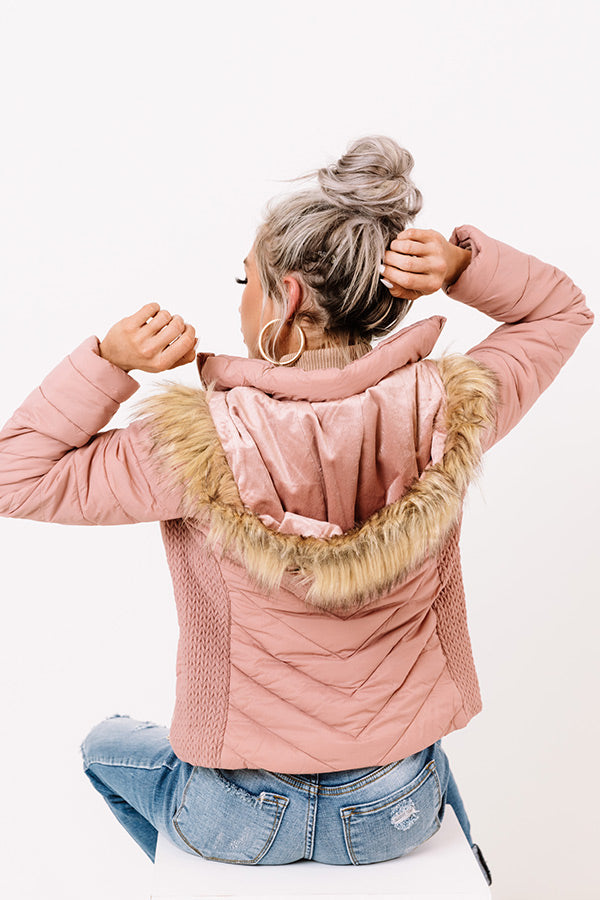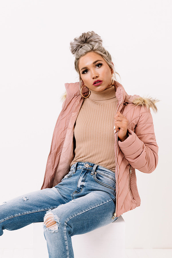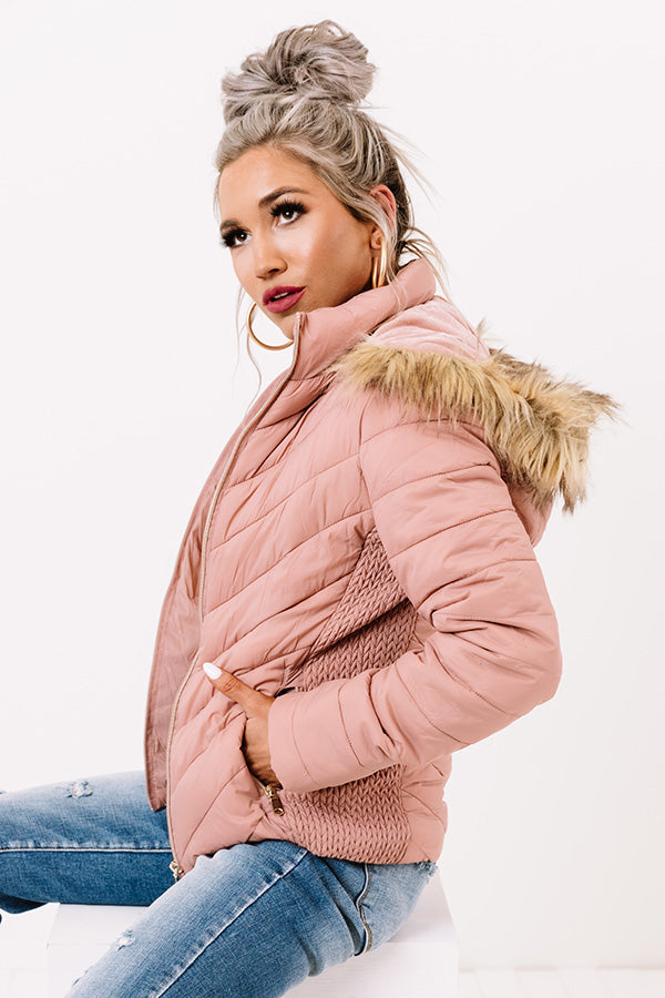 You are guaranteed to be content when you add this adorable blush colored jacket to your everyday winter wardrobe with its sleek lightweight material, diagonal quilted texturing and loose knit side panels, long loose sleeves, low accent pockets, removable hooded back with ultra soft faux fur trim detailing, and zip front silhouette that ends in a straight hemline! Measurements