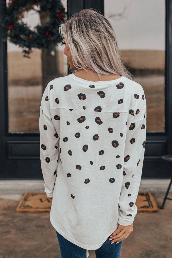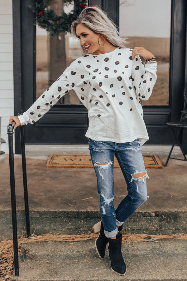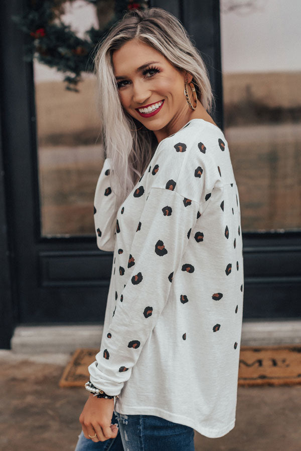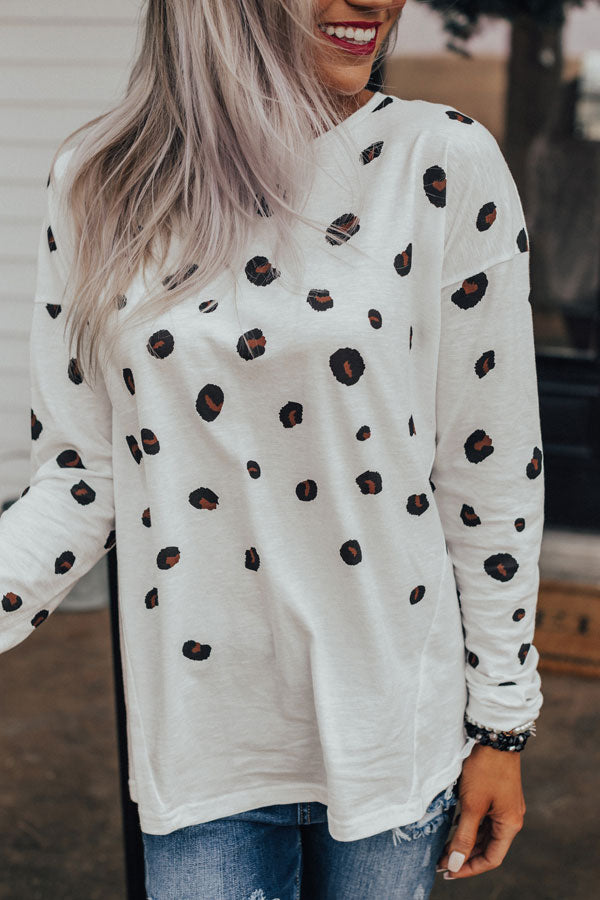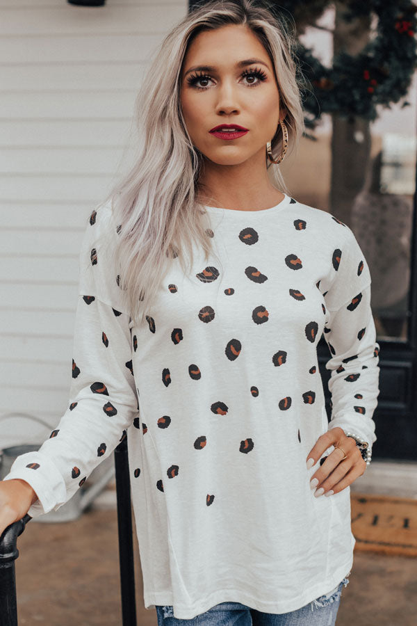 This adorable white shift top is an "everyday delight" with its lightweight material patterned with a black and brown leopard print, a high rounded neckline, long loose sleeves, and a relaxed silhouette that falls into a rounded hemline! You can style this casual cutie a variety of ways, like with some distressed skinnies and black booties, or it can be worn with some black flares, "The Jess Faux Leather Heel in Natural," our "City Nights Faux Leather Clutch in Maple," and our "Pass The Prosecco Wool Hat in Dark Khaki!" Measurements