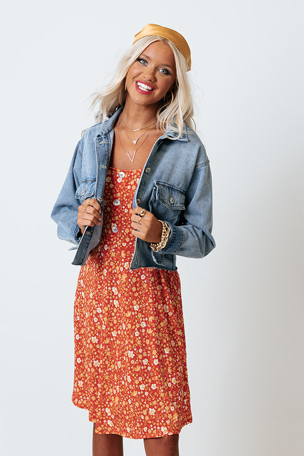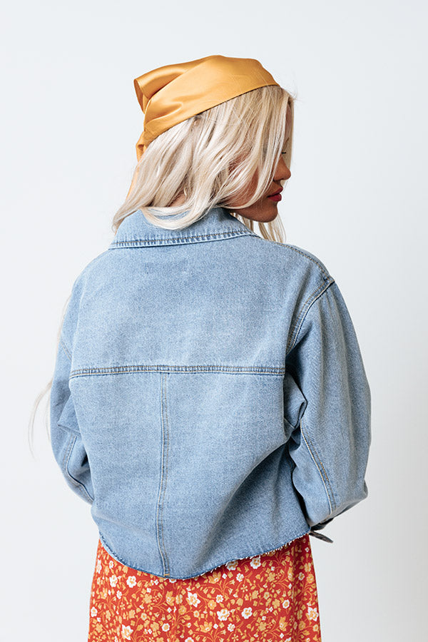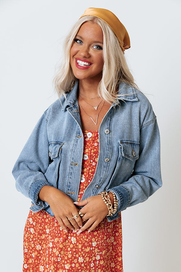 You are sure to be everyone's everyday style inspo when you complete your look with this trendy denim jacket featuring lightweight medium wash material, long loose sleeves with button closure cuffs, two accent chest pockets with flap closure, a button down front with a collared neckline, and a slouched silhouette that ends in a straight cropped hemline! Measurements