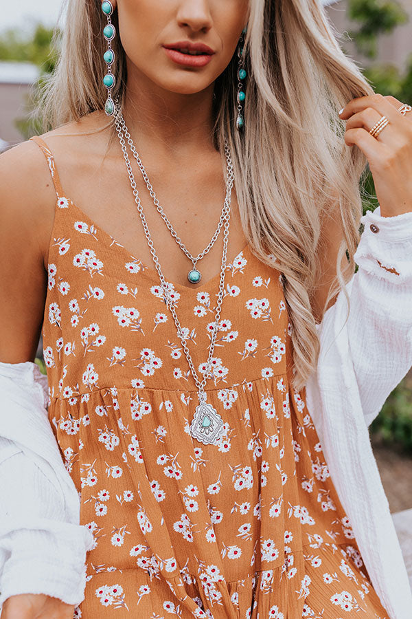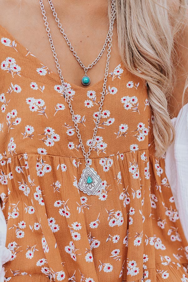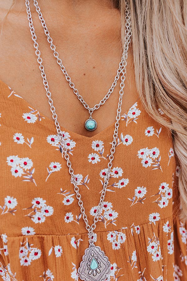 You are sure to be somebody's everyday style inspo when you accessorize with this gorgeous necklace featuring two long silver chains with a small half sphere turquoise stone and a larger stamped silver pendant with a turquoise stone center!