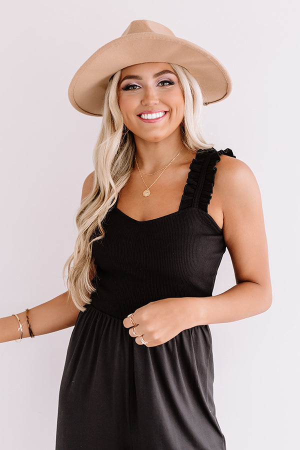 Add a touch of magic to your OOTD with this chic black jumpsuit featuring lightweight stretchy material with subtle ribbed texturing, a scooped v-cut neckline with a form fitting bodice, wide 2-inch ruffled sleeveless shoulder straps, a cinched waistline, and an ultra relaxed pants silhouette that falls into straight mid-calf length hemlines! We have styled this everyday piece with some matching black block heels, a brown faux leather bucket bag, a leopard statement belt, and a neutral faux suede hat, but you can also wear it layered under a cropped jean jacket with some sunnies and the "Gadol Slip on Sneaker!" Measurements