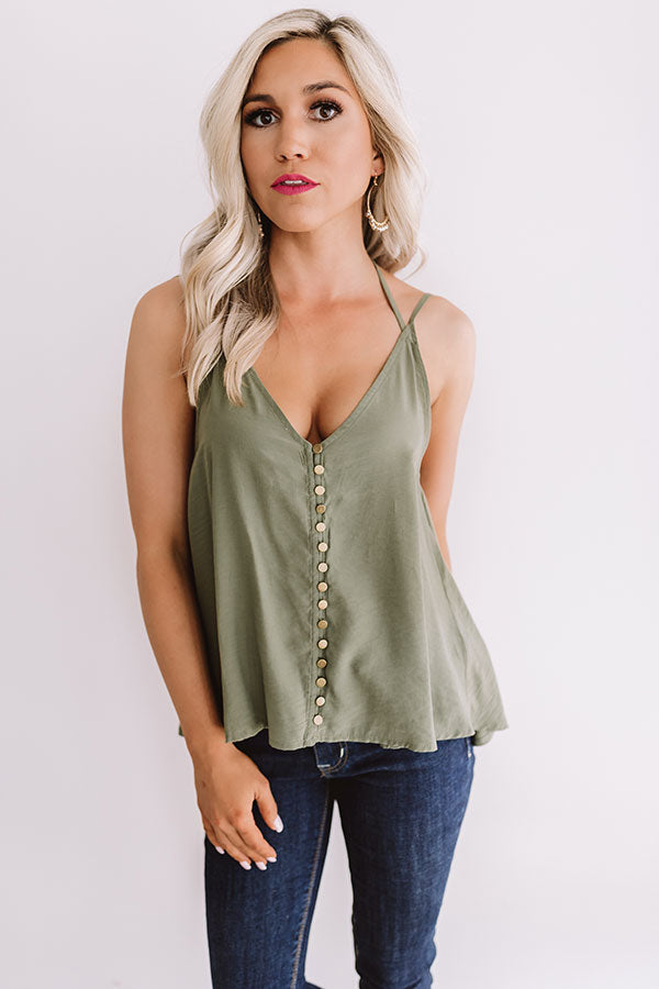 May your heart and your closet be full this summer with dresses, shorts, sandals and especially shift tanks! This sage shift piece has double spaghetti straps on both shoulders, a v-back, and bronze buttons down the front! Pair with some trousers and a blazer for a professional working girl look or with some distressed denim and hair scarf for a perfect everyday outfit! Measurements