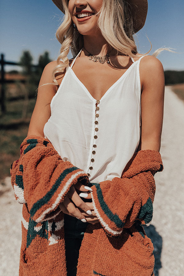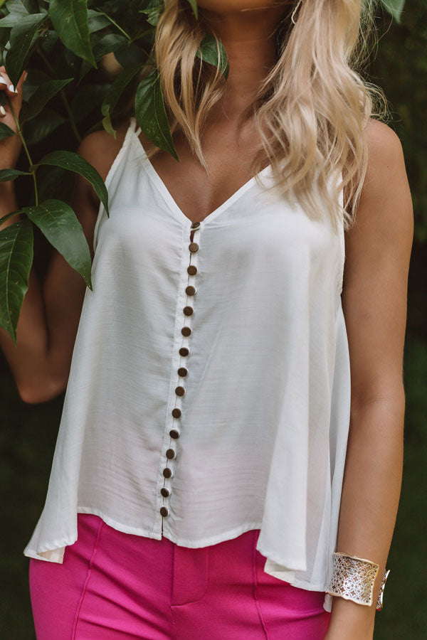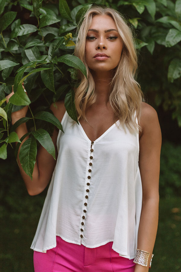 Your OOTD will be perfection every time you wear this white shift tank featuring lightweight material, double spaghetti straps on both shoulders, a deep v-cut neckline and open back, and a relaxed bronze button silhouette that falls into a straight hemline! This piece can be worn in the fall under a knit cardigan with some colored flares, booties, and a neutral faux suede hat, or you can style it for the warmer summer months by tucking it into some distressed denim shorts with sunnies, a crossbody, and trendy sandals! Measurements