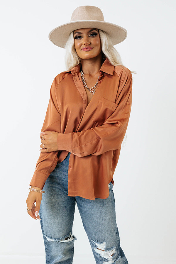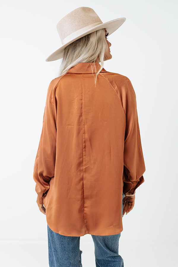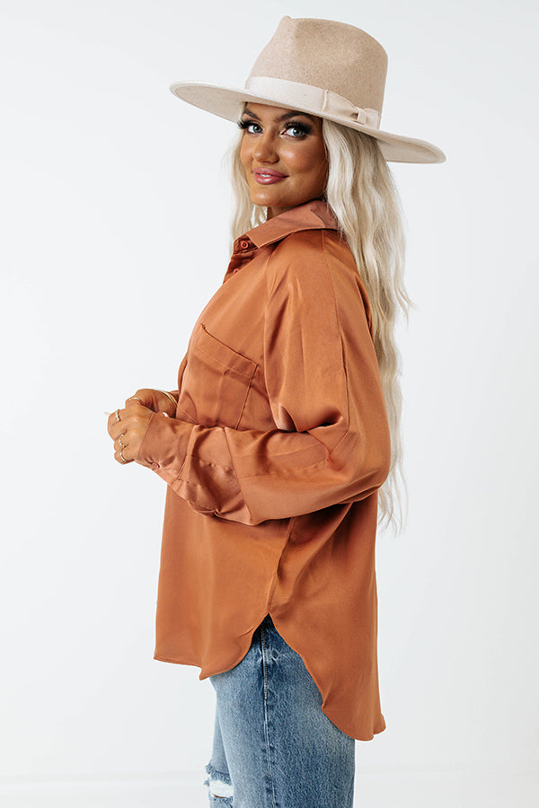 Stay timeless in our classy rust colored 'Everyday Rumors' top featuring lightweight satin material, a button down front with a collared neckline, long loose sleeves with button closure cuffs, a single accent chest pocket, and a relaxed silhouette that falls into a rounded hemline!
