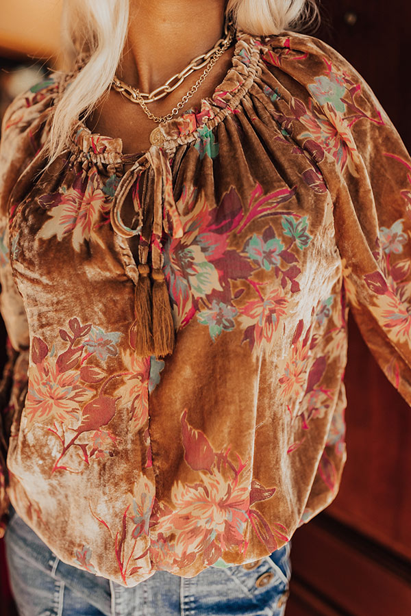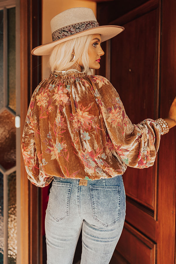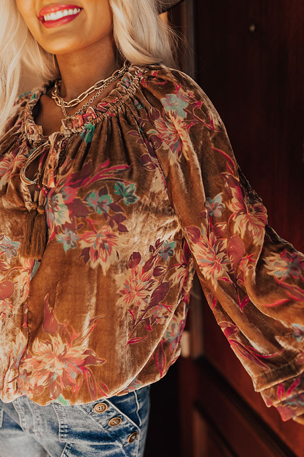 Show off your excellent taste in clothing with this beautiful chocolate colored bodysuit featuring soft velvet material patterned with a pretty floral print, a rounded neckline with a tie closure, long loose sleeves, and a relaxed silhouette that ends in cheeky fit bottoms with a snap button closure!