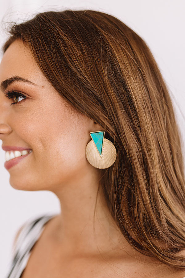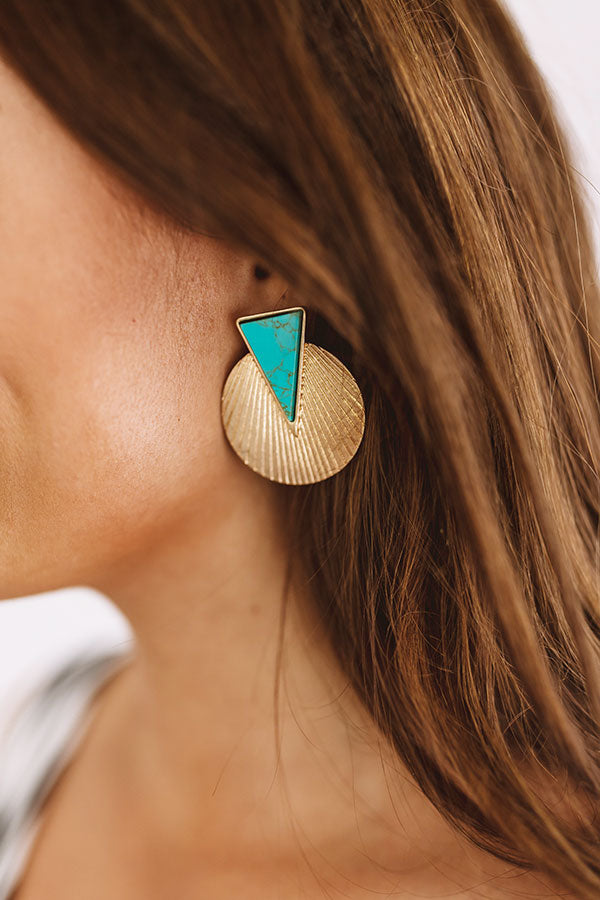 These exclusive earrings feature a turquoise triangle stone stud with a golden circle shell fan that guarantees your ears will be the life of the after party!