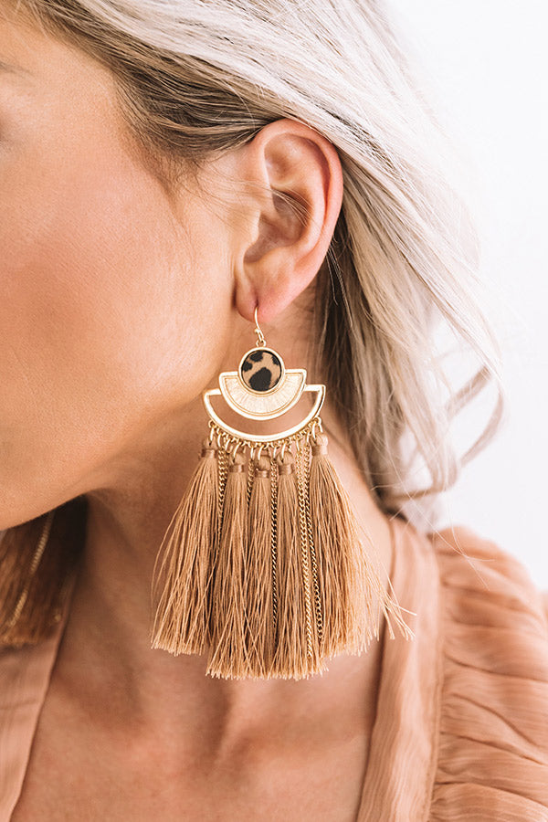 You won't find a better piece to accessorize with when attending an "exclusive event" than these statement earrings featuring a small dangling leopard print circle with a golden half moon pendant and four long neutral colored string tassels!