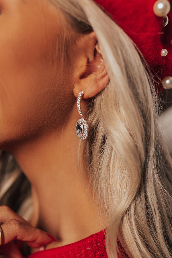 Featuring silver semi-hoops adorned with shimmering rhinestone and dangling framed oval cut rhinestone design