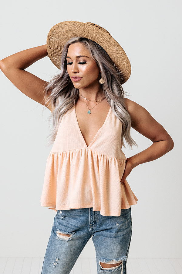 In our expert opinion...this adorable peach colored tank should be your new go-to summer top! It features lightweight material with subtle knit texturing, a deep v-cut neckline, 1-inch shoulder straps with a racerback fit, and a relaxed Babydoll silhouette that ends in an uneven hemline! Measurements