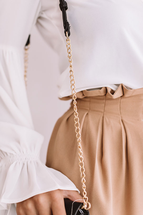 "Express yourself" in this black faux leather purse featuring a flap and snap closure with an accent gold hoop, two inner pouches plus a zip up one, and an adjustable and removable gold chain and black strap!