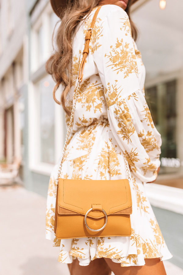 "Express yourself" in this mustard faux leather purse featuring a flap and snap closure with an accent gold hoop, two inner pouches plus a zip up one, and an adjustable and removable gold chain and black strap!
