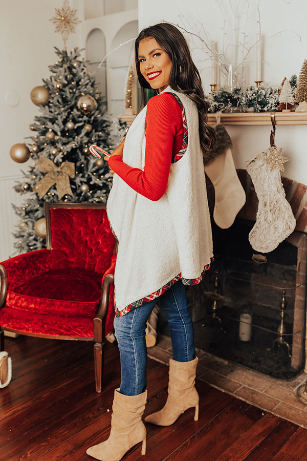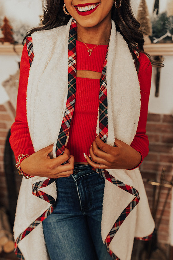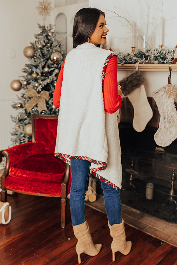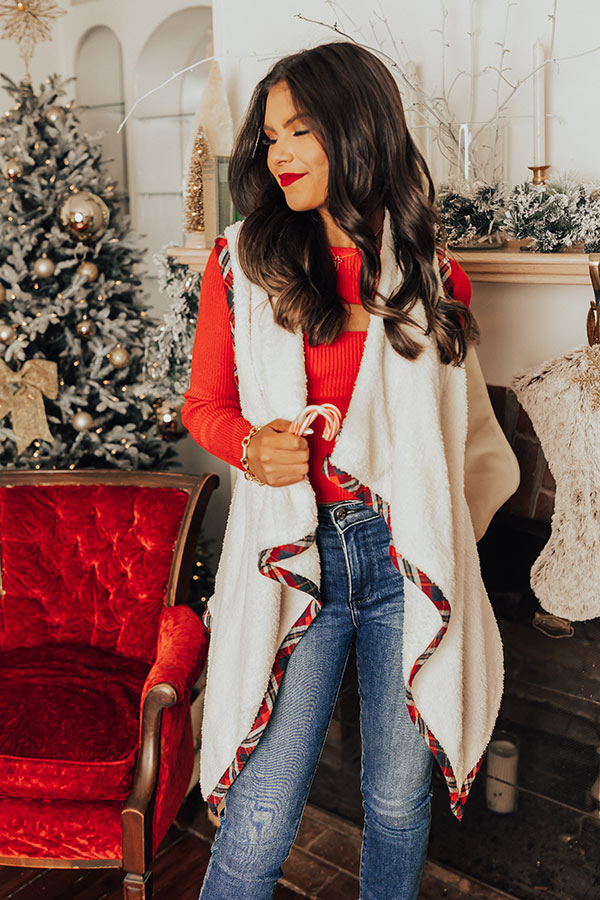 Layer up in style with our cream colored "Extended Stay" vest featuring soft lightweight sherpa material, blue and red plaid trim detailing, wide shoulder straps, a draped flap collar, and an ultra relaxed open front silhouette that falls into an uneven mid-thigh length hemline! You can wear this versatile piece with just about anything from a basic tank to a sweater, jeans to skirts or dresses, booties to wedges or sandals, clutches to totes, and hats to earrings!
