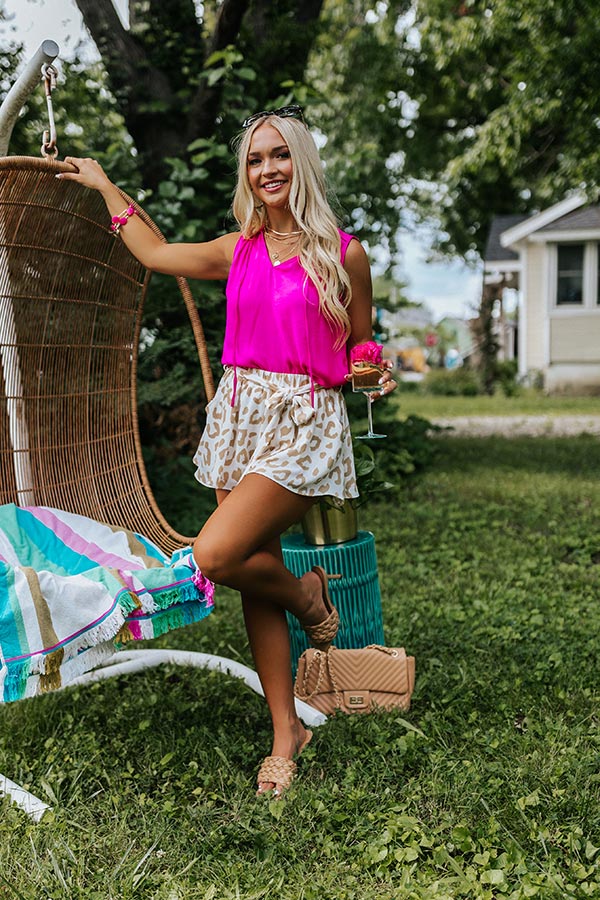 There'll be no need to put extra effort into your look when you wear this darling fuchsia shift top featuring lightweight material, a collared v-cut neckline with a tie closure, and a slouched silhouette that falls into a rounded hemline!