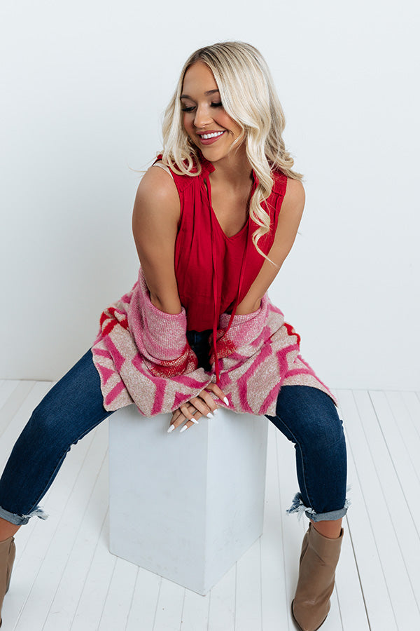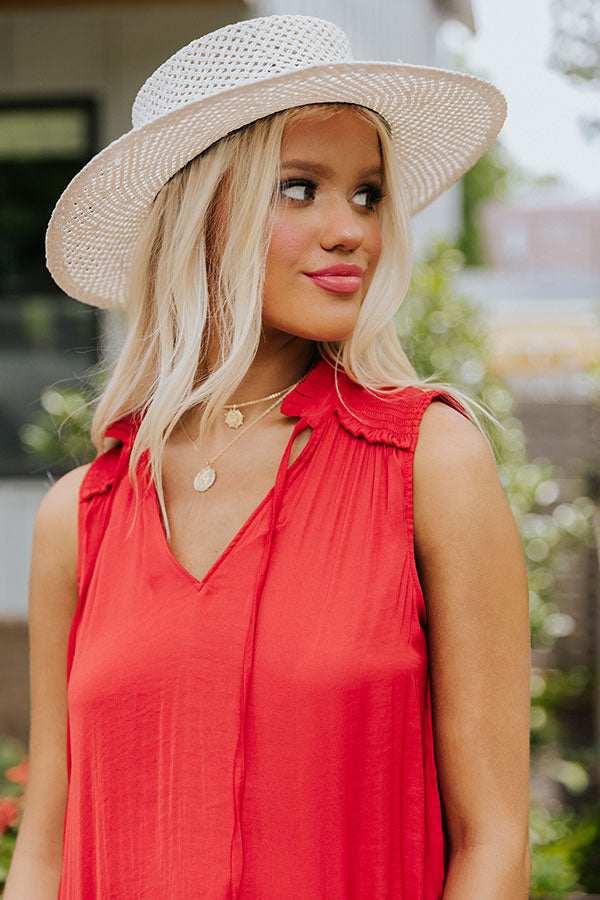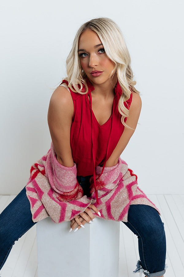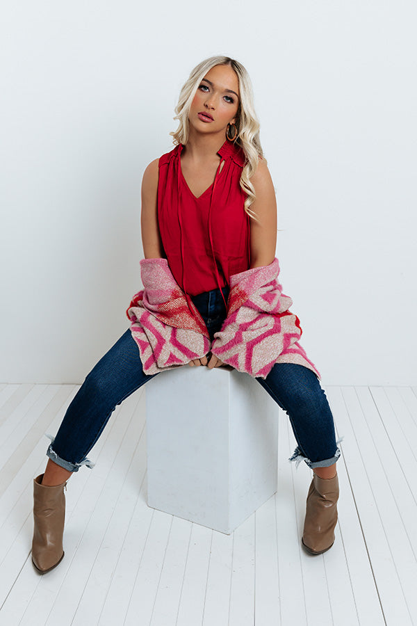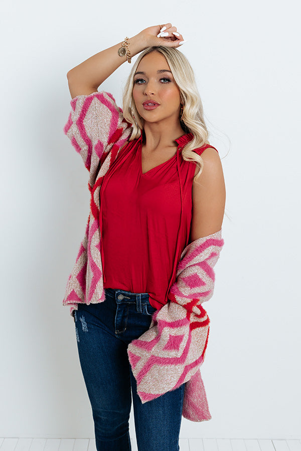 There'll be no need to put extra effort into your look when you wear this darling red shift top featuring lightweight material, a collared v-cut neckline with a tie closure, and a slouched silhouette that falls into a rounded hemline!