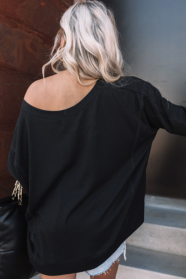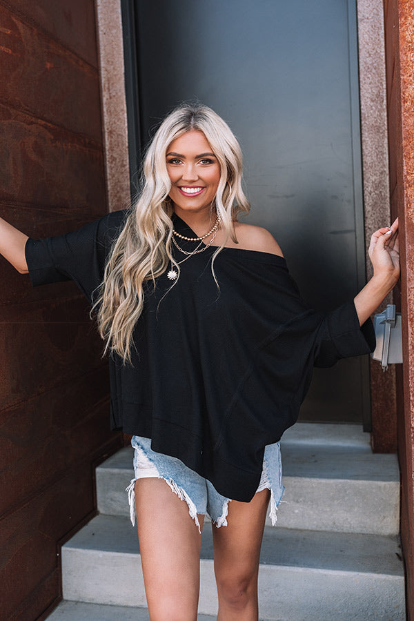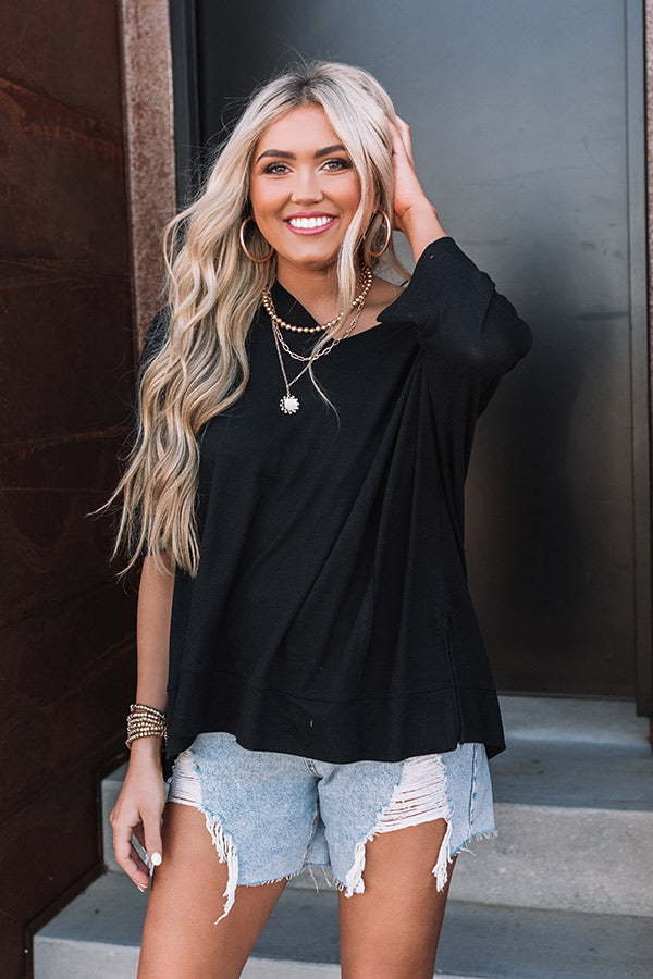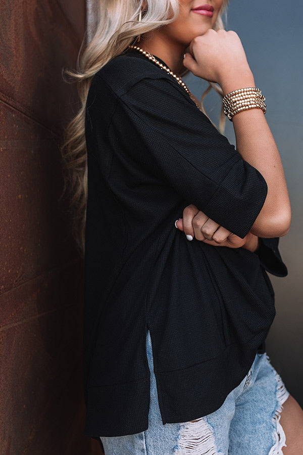 We have no doubt you will be extra grateful you added this adorable black top to you wardrobe with its soft lightweight material, waffle knit texturing, a wide v-cut neckline that can be worn to one side, loose 3/4-length sleeves, and a slouched silhouette that ends in a straight hemline with accent side slits! Measurements