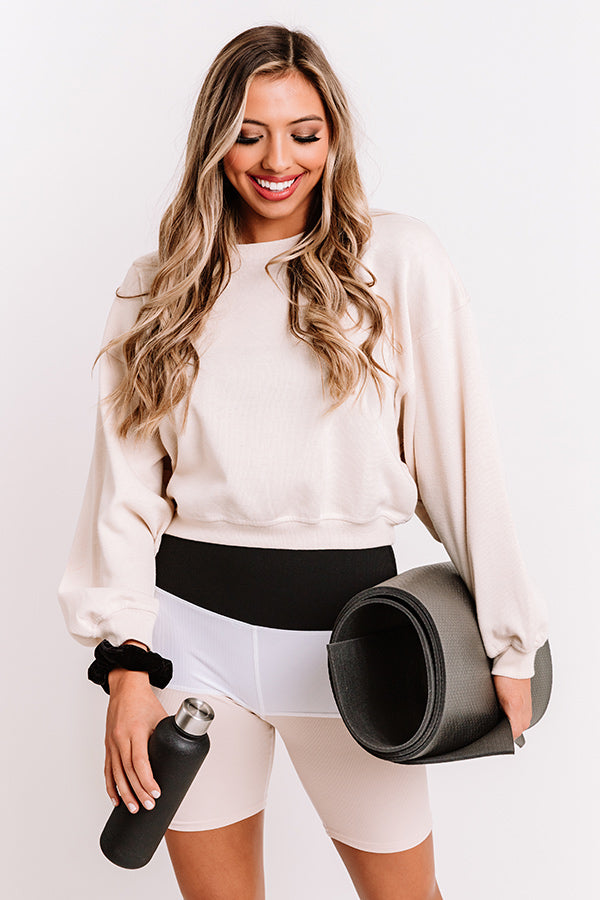 Go the extra mile and add this cutie to your cart...don't just wish for it! This casual light beige colored sweatshirt features soft lightweight material, a high rounded neckline, long loose sleeves with fitted cuffs, and a slouched silhouette that ends in a straight cropped hemline! Measurements