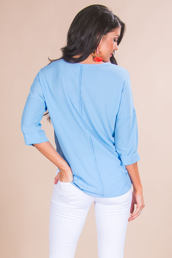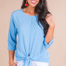 Plans change... Be prepared for the unexpected with the "Eye Candy Shift Top!" This powder blue beauty has quarter-length cuffed sleeves, a relaxed poly bodice & a trendy tie-bottom hem that can be easily dressed up or down. Style with white skinnies, & your sandal or wedge of choice, for a chic look in minutes!
