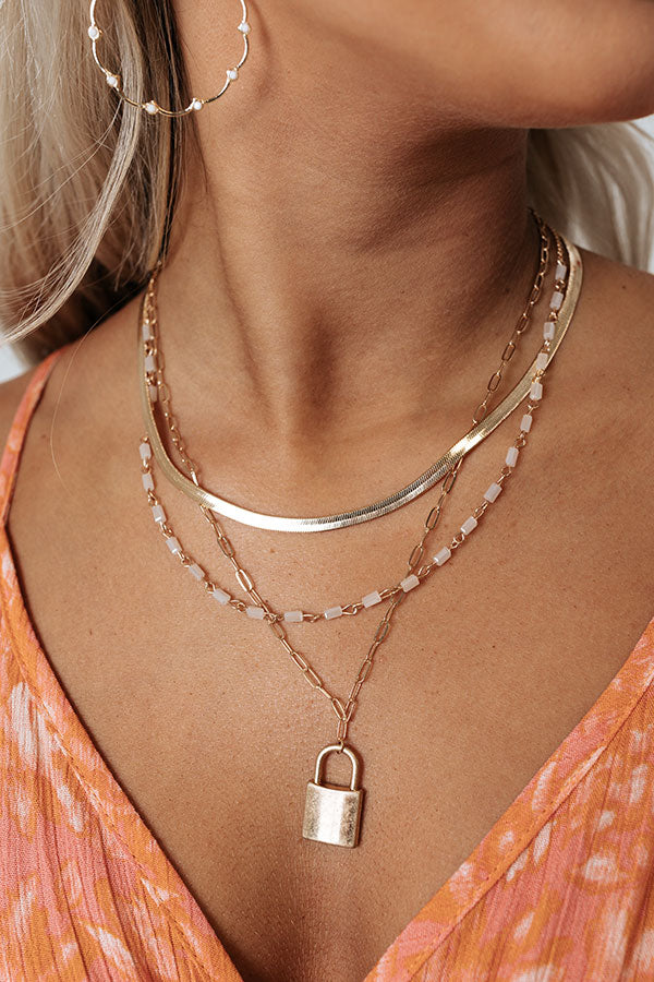 We have no doubt you will be obsessed with our adorable 'Eyes On Paradise Layered Necklace' featuring three gold pieces: a short snake chain, a medium length beaded chain, and a longer link chain with a lock pendant!