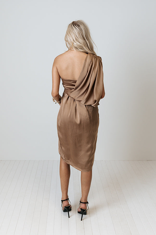 All eyes are sure to be on you when you arrive in this striking mocha colored dress featuring sleek lightweight material, a flattering one shoulder toga style bodice and a relaxed but flirty silhouette that falls into a mid-calf length side tulip hemline! Measurements