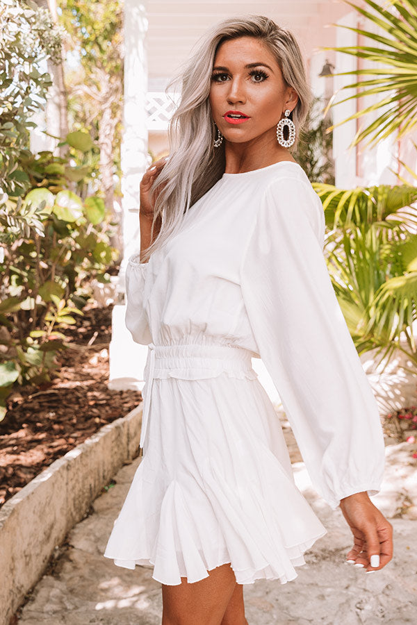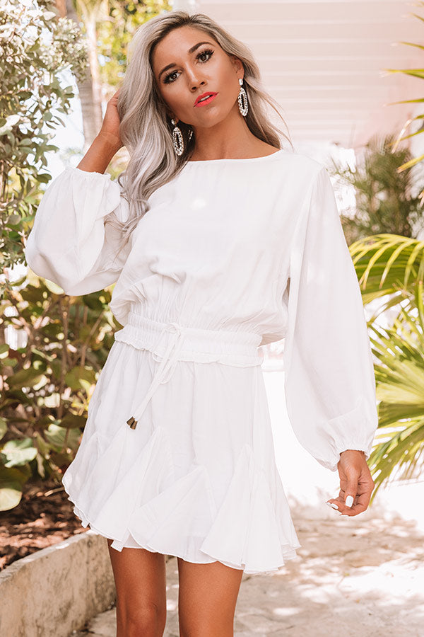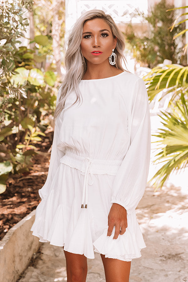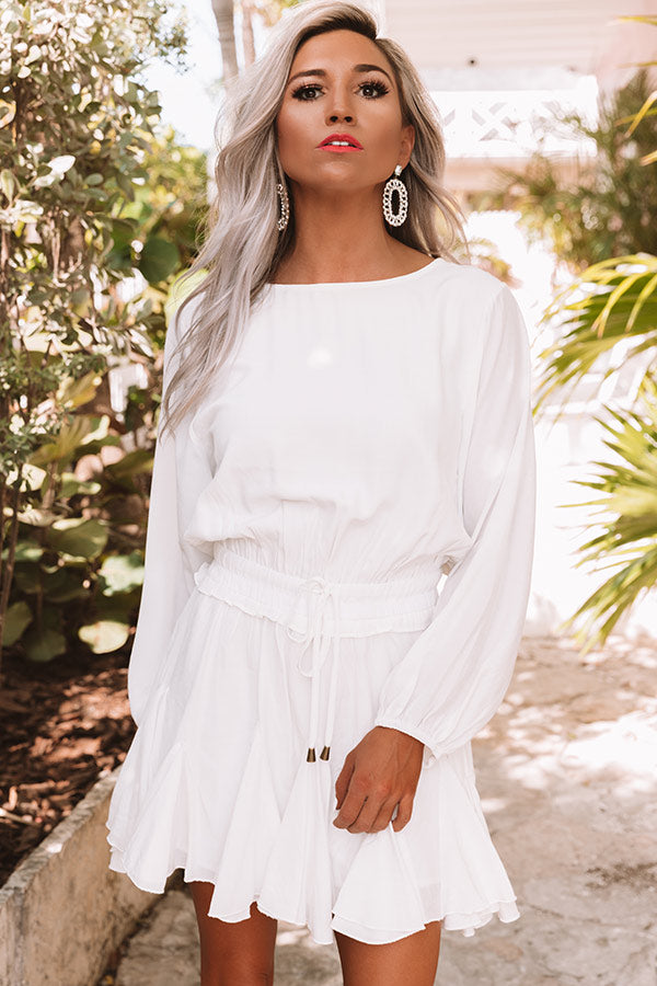 It will be a "fabulous surprise" how much you love this little white romper featuring lightweight sating material, a wide rounded neckline, long loose bishop sleeves with fitted elastic banded cuffs, a button closure back, a smocked waistband with a tie belt, and a relaxed silhouette that falls into a ruffled mid-thigh length hemline! We have styled this adorable piece with some neutral heels and statement earrings, but you can also add a pop of color by wearing it with "The Brighton Espadrille in Blue" and our "Prettier By The Pacific Hat in Ocean Blue!" Measurements