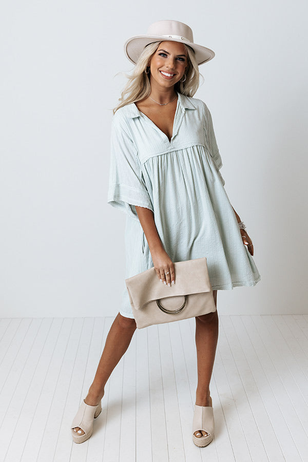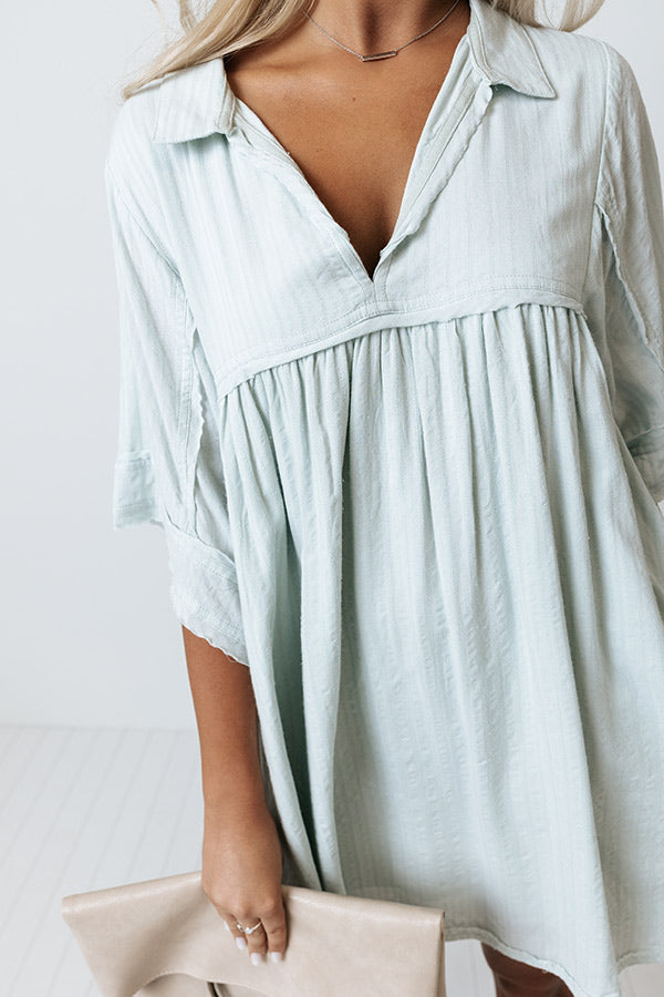 Prance from season to season in style with our darling mint colored 'Fairy Dust' dress featuring lightweight and flowy linen like material, a collared v-cut neckline, loose half sleeves with raw cut trim, hidden side pockets, and an ultra relaxed babydoll silhouette that falls into a straight mid-thigh length hemline! Measurements