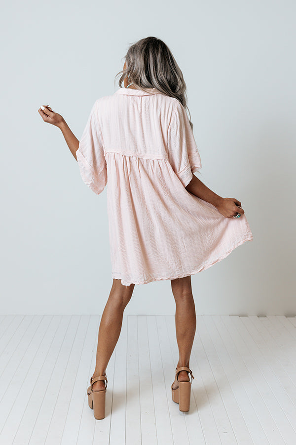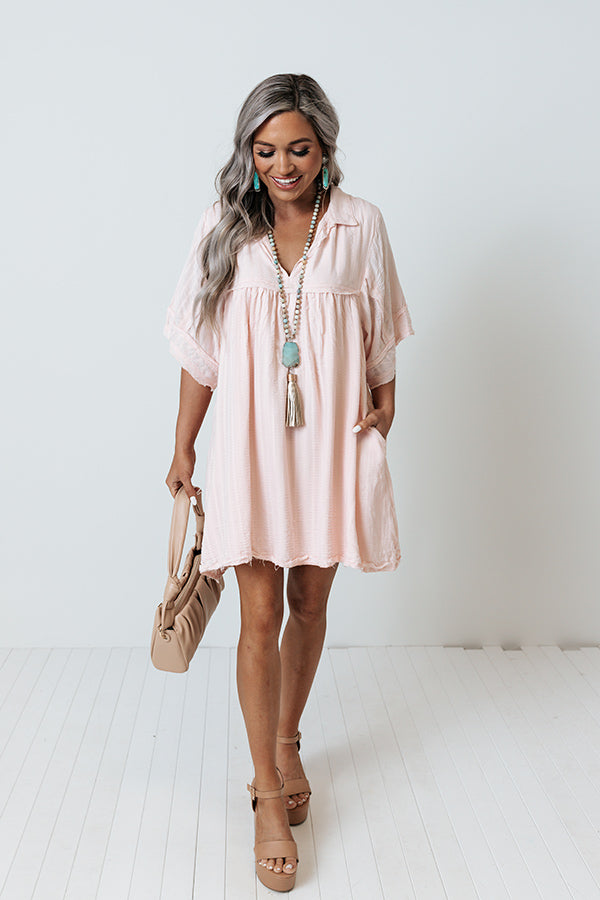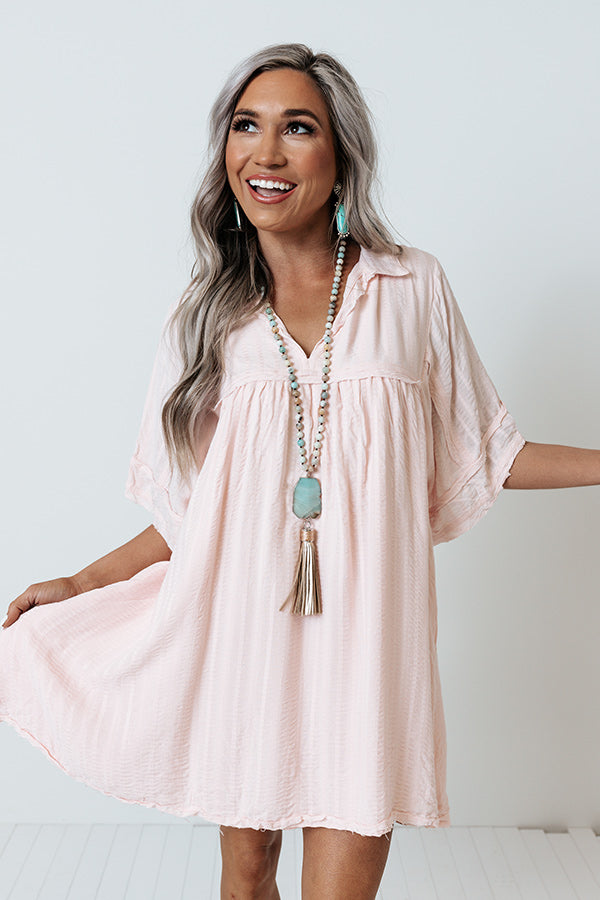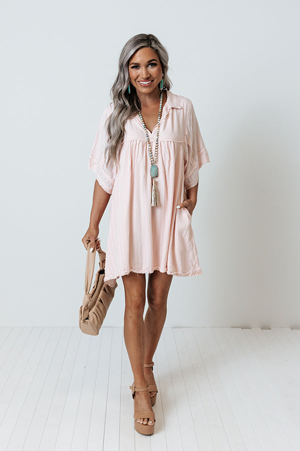 Prance from season to season in style with our darling pink 'Fairy Dust' dress featuring lightweight and flowy linen like material, a collared v-cut neckline, loose half sleeves with raw cut trim, hidden side pockets, and an ultra relaxed babydoll silhouette that falls into a straight mid-thigh length hemline! Measurements