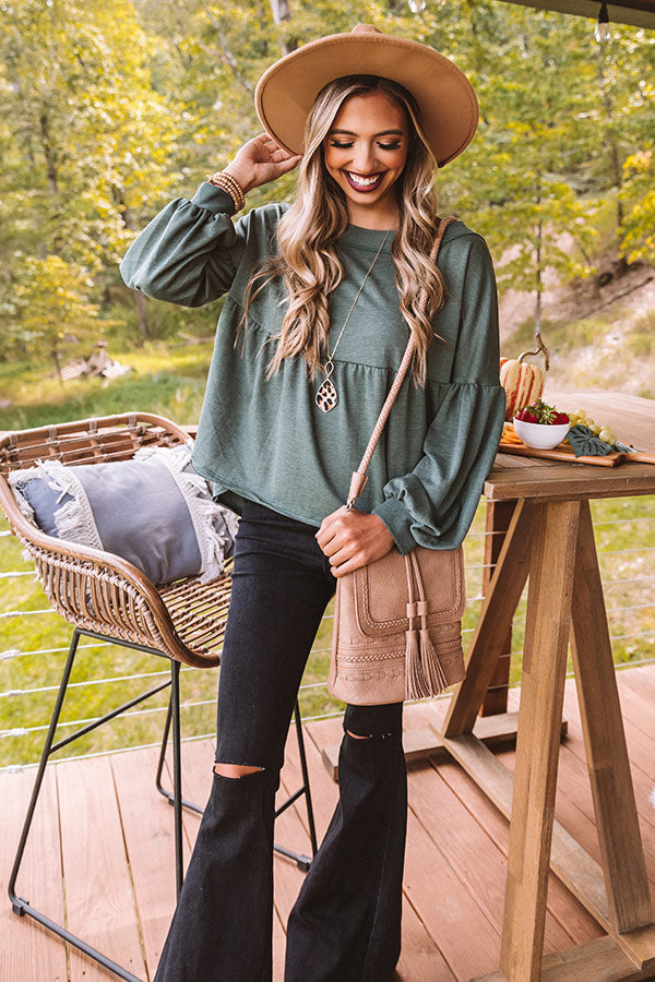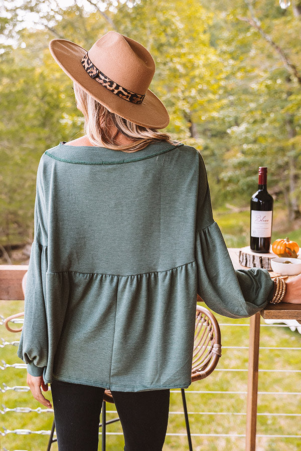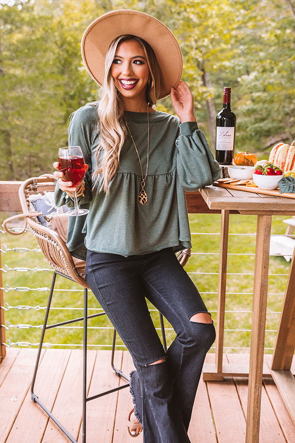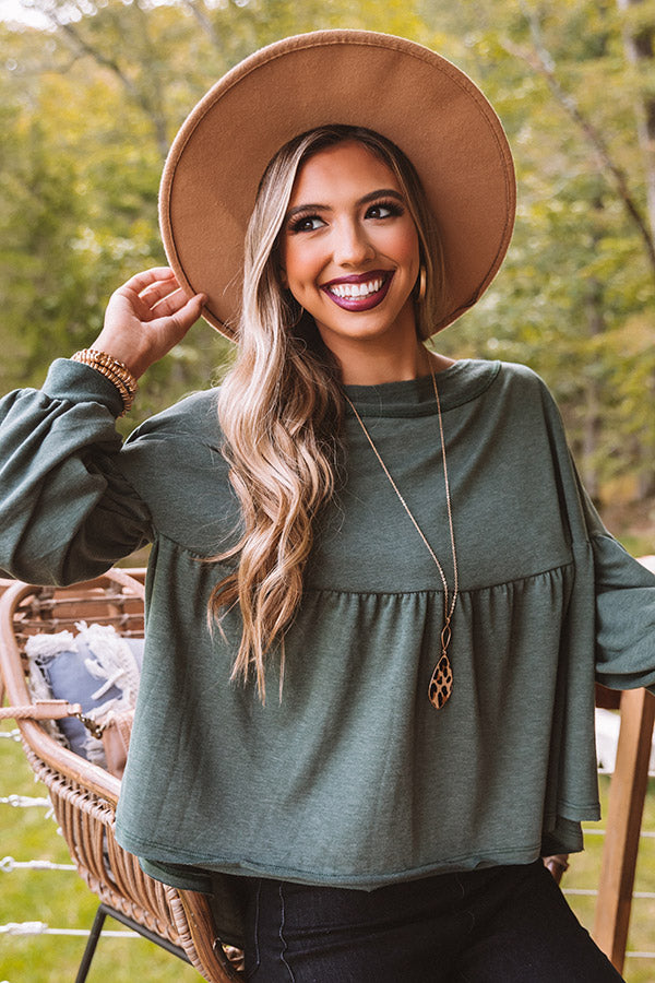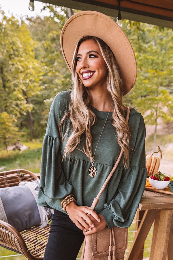 Heat up your cold weather wardrobe with our stunning hunter green "Fall Destination" sweater featuring ultra soft lightweight tight knit material, a wide rounded neckline that can be worn off one shoulder, long oversized bubble sleeves with fitted cuffs, and a relaxed babydoll silhouette that falls into an uneven hemline! Measurements