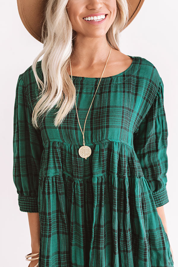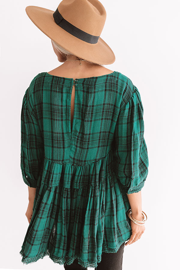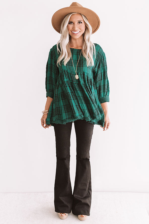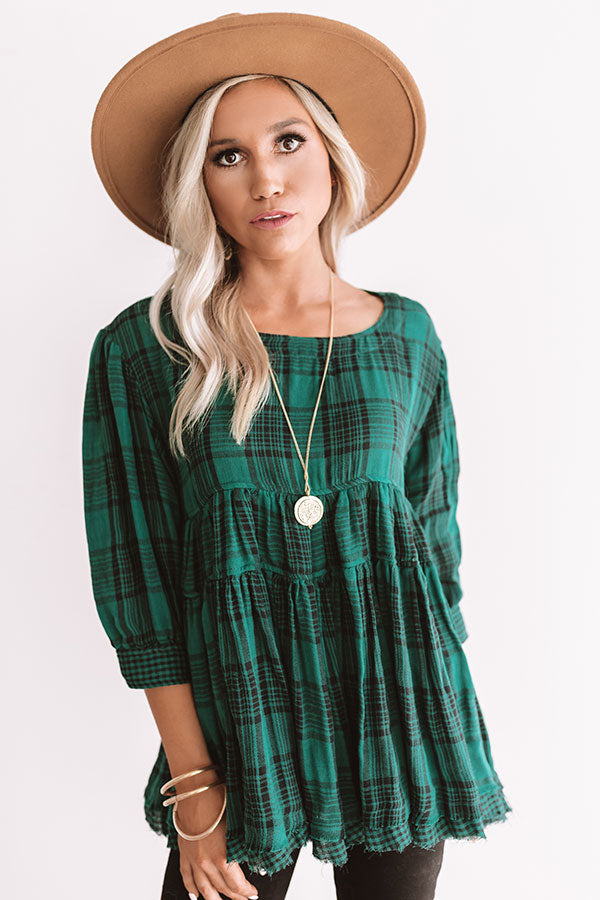 Arrive in style to the "fall farmer's market" with this adorable lush meadow colored top featuring a black plaid pattern, lightweight material, loose half sleeves with checkered button closure cuffs, a keyhole accented upper back with a two button closure, and a tiered babydoll silhouette that falls into an uneven eyelash fringe hemline! We have styled this unique transitional piece with some black flares and a neutral platform heel and faux suede hat, but it also looks perfect styled with some distressed ankle skinnies, "The Franco Perforated Bootie in Black," and our "Jetset To Italy Tote in Black!" Measurements