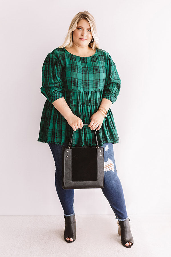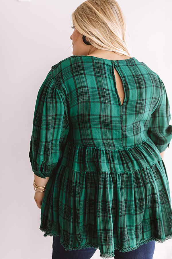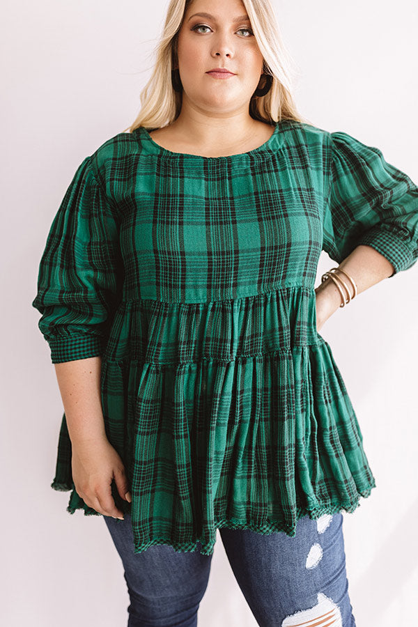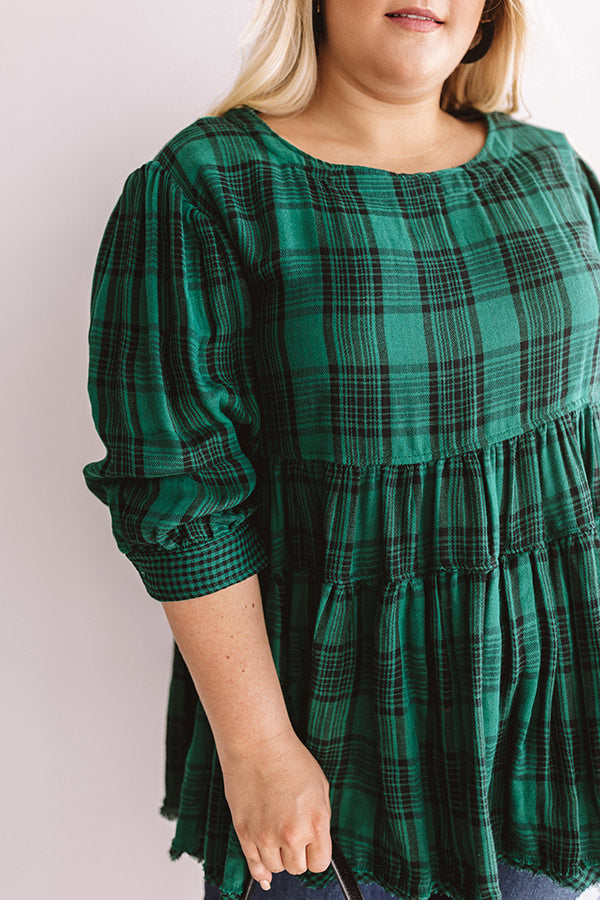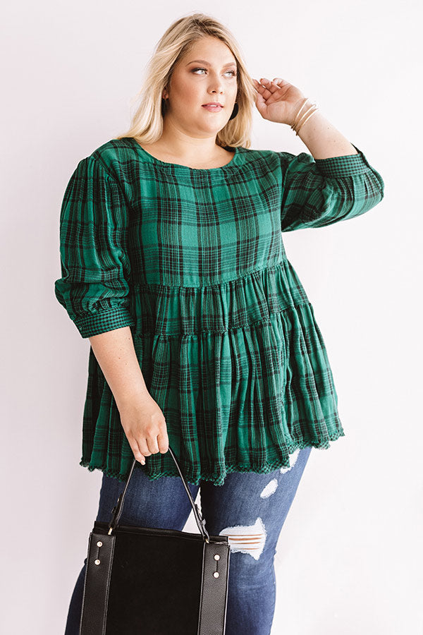 Plus Size - Arrive in style to the "fall farmer's market" with this adorable lush meadow colored top featuring a black plaid pattern, lightweight material, loose half sleeves with checkered button closure cuffs, a keyhole accented upper back with a two button closure, and a tiered babydoll silhouette that falls into an uneven eyelash fringe hemline! We have styled this adorable piece with some distressed ankle skinnies and a black bootie and tote, but you can also wear it with some black flares, "The Pryor Peep Toe Bootie in Iced Latte," and our ""Vintage Vibes Felt Hat in Iced Latte!" Measurements