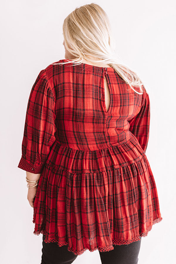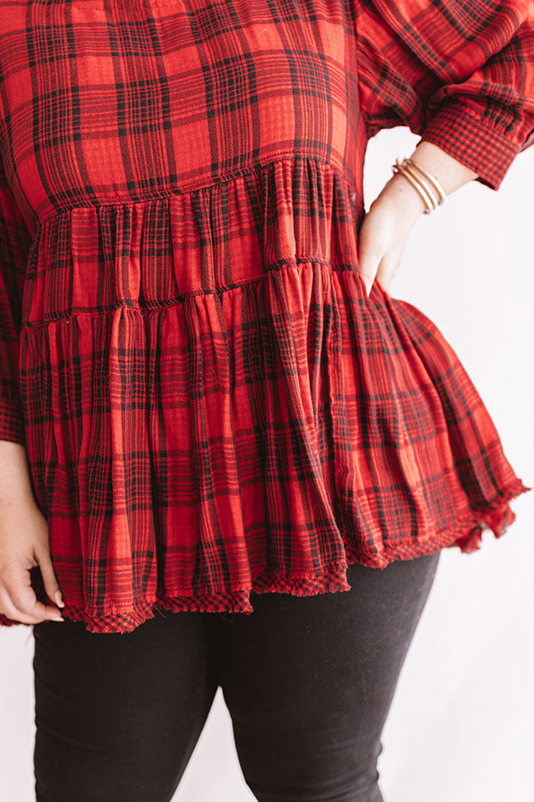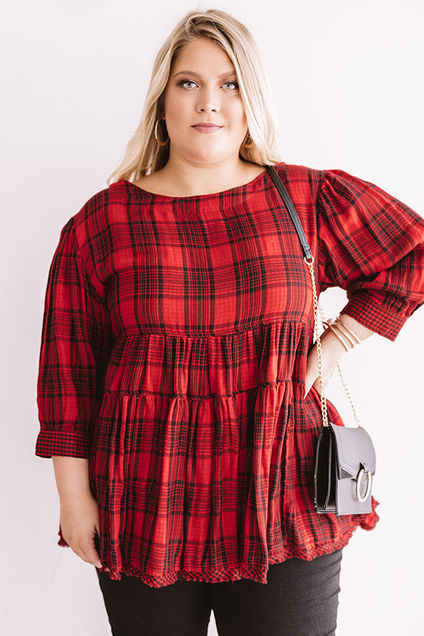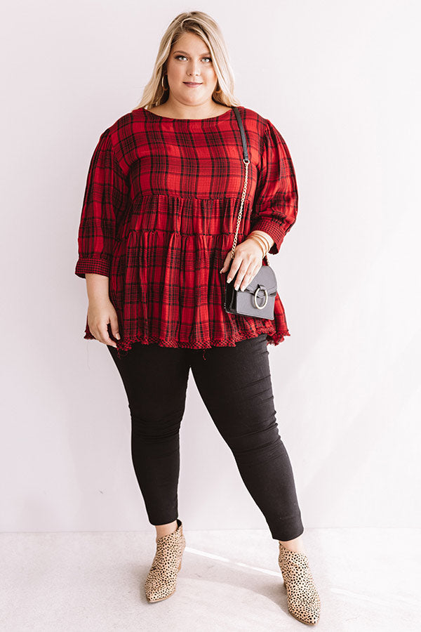 Plus Size - Arrive in style to the "fall farmer's market" with this adorable red top featuring a black plaid pattern, lightweight material, loose half sleeves with checkered button closure cuffs, a keyhole accented upper back with a two button closure, and a tiered babydoll silhouette that falls into an uneven eyelash fringe hemline! We have styled this piece with some black ankle skinnies, leopard booties, and a chic crossbody, but you can also wear it with some dark wash denim flares, "The Jess Faux Suede Heel in Black," and "The Jonas Heel in Black!" Measurements