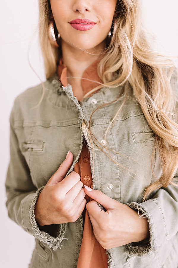 Look stylish while hanging fireside during the fall with this light olive colored jacket featuring a lightweight fit, fringed trim, a rounded neckline, four accent pocket cuts (not actual pockets), long loose sleeves with snap button closures, and a button up front that finishes with a straight cropped hemline! This versatile layering piece looks perfect worn over a simple top with some distressed skinnies and a dark neutral peep toe bootie and tote, or you can style it with a basic tie front white tee, black flares, "The Elena Snake Print Heel," and our "Twist And Shout Snake Print Headband!" Measurements