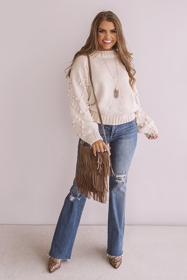 You are sure to FALL for this cream hued sweater featuring warm loose knit material, a high rounded neckline with large ribbed texturing, long loose sleeves with pom pom accents and fitted cuffs, and a relaxed silhouette that falls into a straight hemline! This neutral essential styles perfectly with some distressed denim flares, snake print booties, and a brown fringe crossbody, or it can be paired with "The Hallie High Waist Corduroy Skinny," "The Jess Faux Leather Heel in Natural," and our "Vintage Vibes Felt Hat in Dark Rust!"