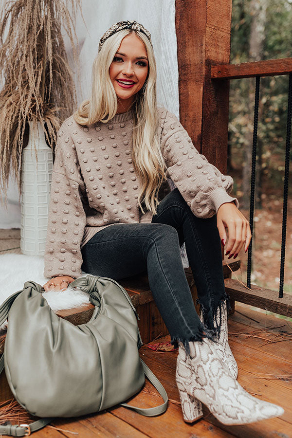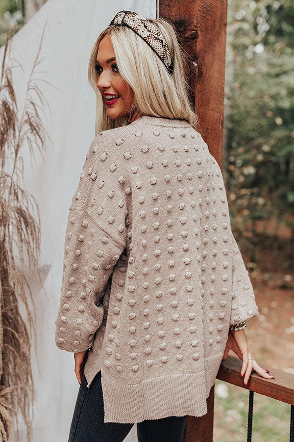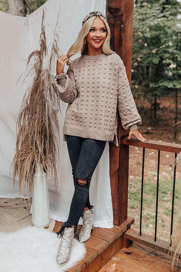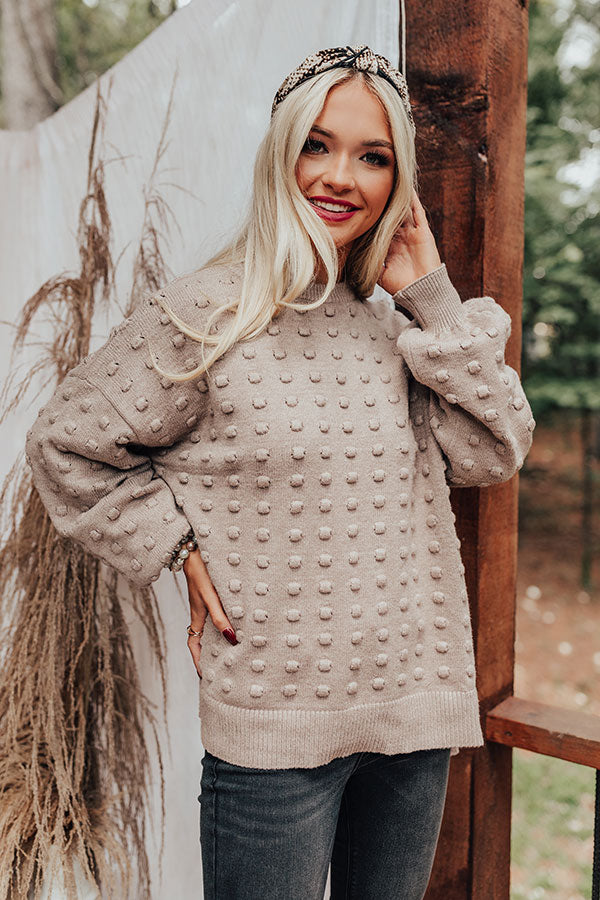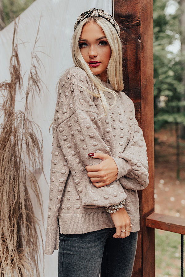 Head out for your "fall getaway" in style with this charming taupe colored sweater featuring ultra soft and thick tight knit material with pompom texturing, a high rounded neckline, ribbed trim detailing, long bishop sleeves with fitted cuffs, and a relaxed silhouette that falls into a straight hemline with accent side slits! Measurements