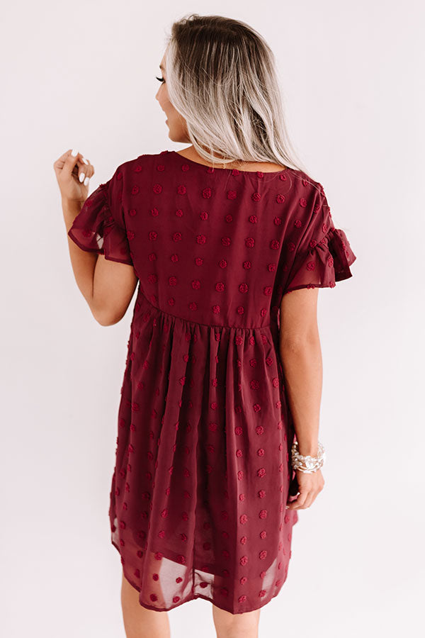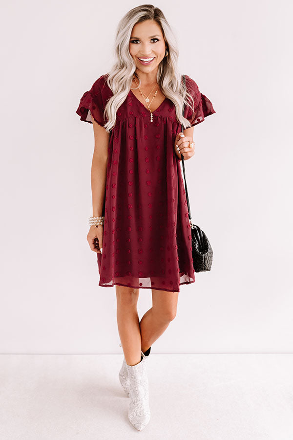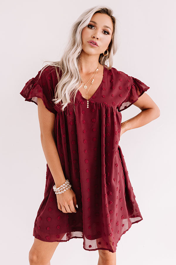 This adorable wine colored dress is sure to be a highlight of your fall with its lightweight material, large polka dot pattern texturing, a v-cut neckline, short sleeves with ruffled trim detailing, and a relaxed babydoll silhouette that falls into a straight mid-thigh length hemline! Measurements