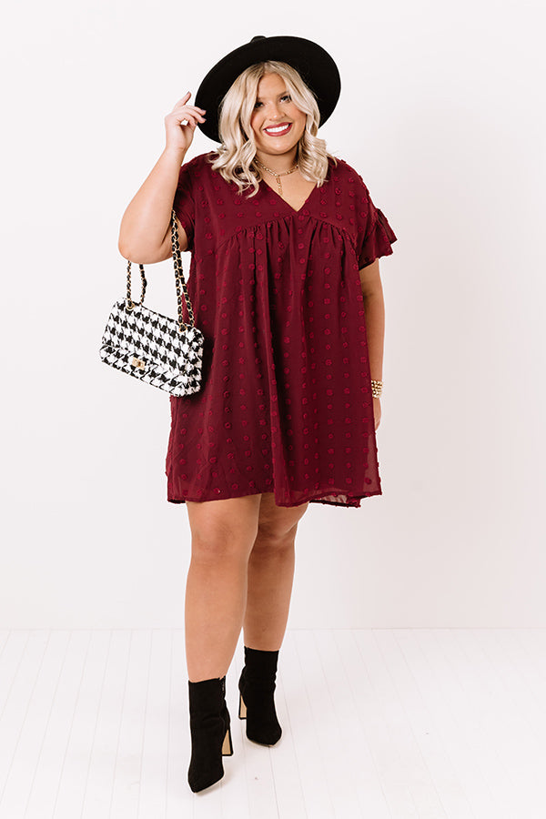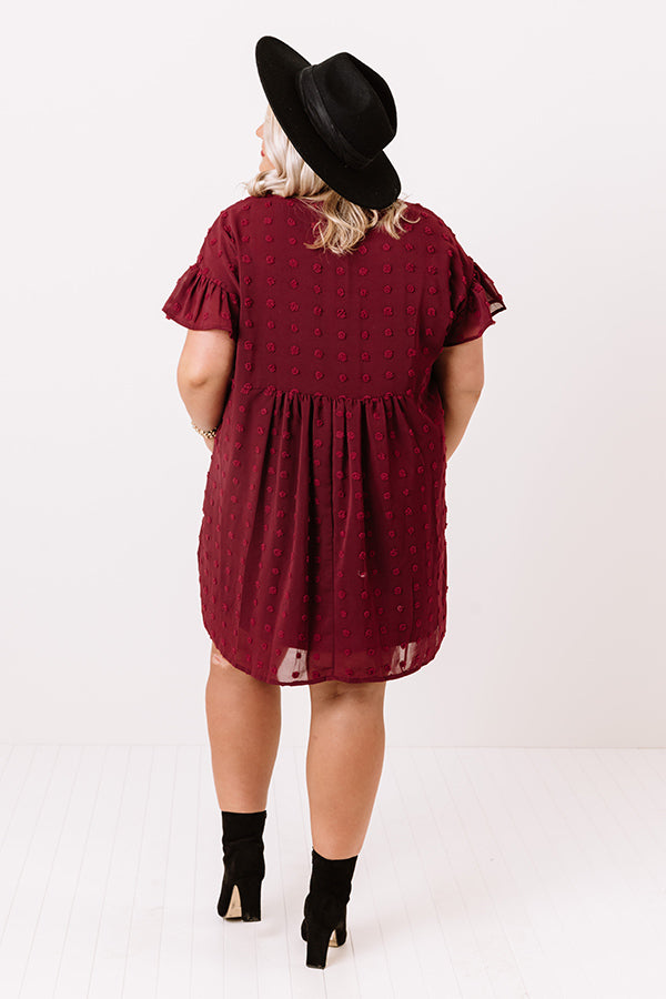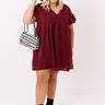 Plus Size - This adorable wine colored dress is sure to be a highlight of your fall with its lightweight material, large polka dot pattern texturing, a v-cut neckline, short sleeves with ruffled trim detailing, and a relaxed babydoll silhouette that falls into a straight mid-thigh length hemline! Measurements